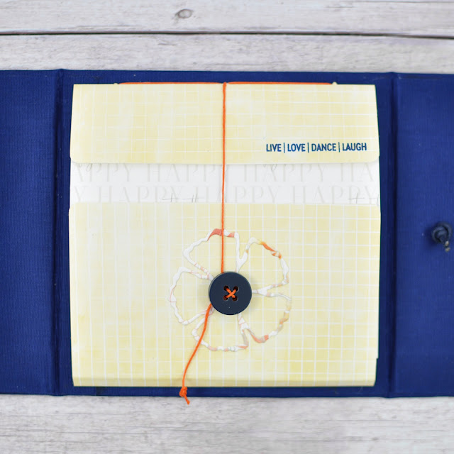 Pour l'arrière-plan de la mise en page, j'ai simplement cousu un papier transparent et rempli les différentes poches avec des parties éparses de couleurs assorties. Je pense que cela donne un arrière-plan intéressant et j'avais de si belles pièces de shaker jaune différentes de Zibuline... Je les ai utilisées pour cela.